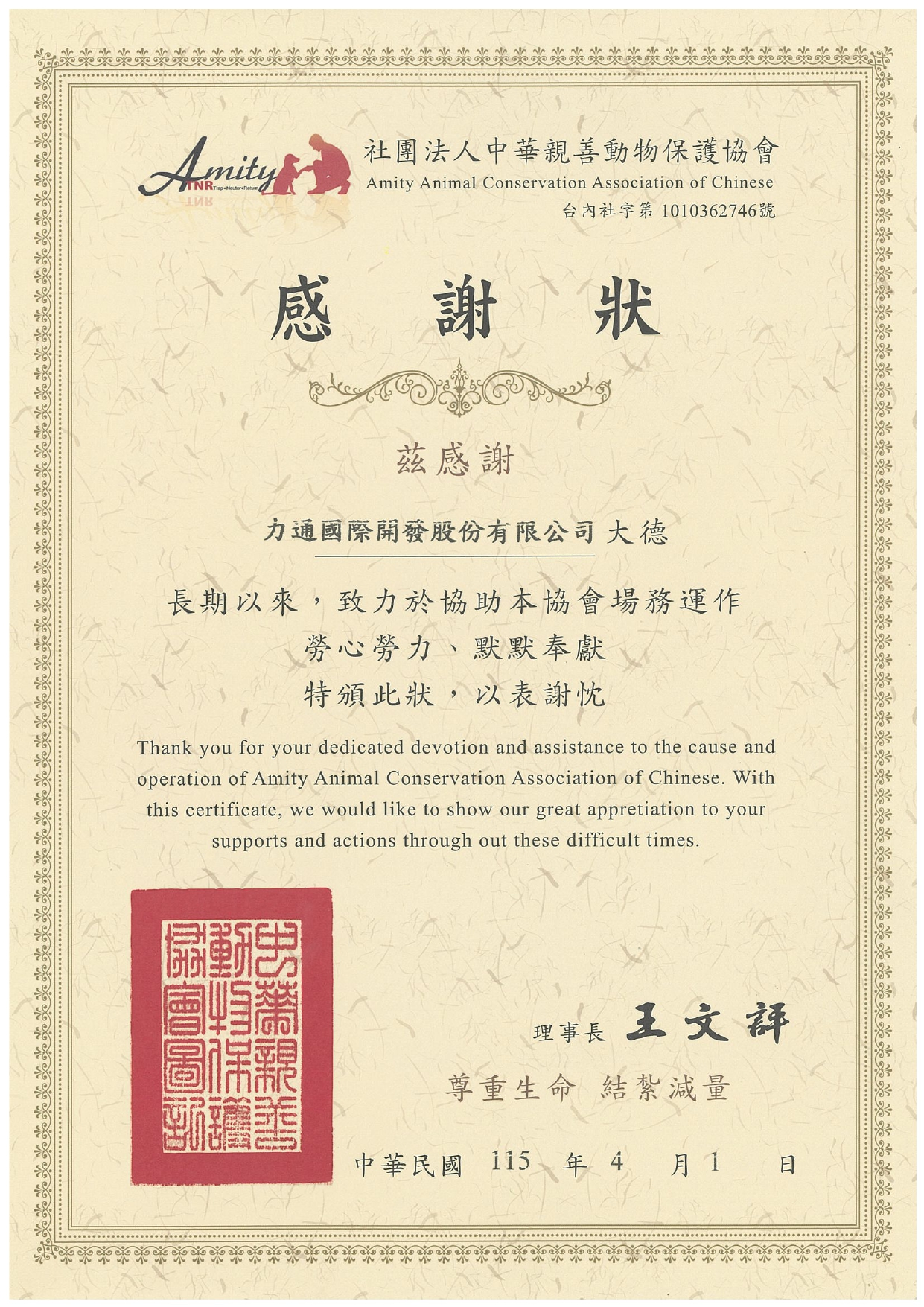 力通企業公司 永續關懷捐助親善動保協會感謝狀...